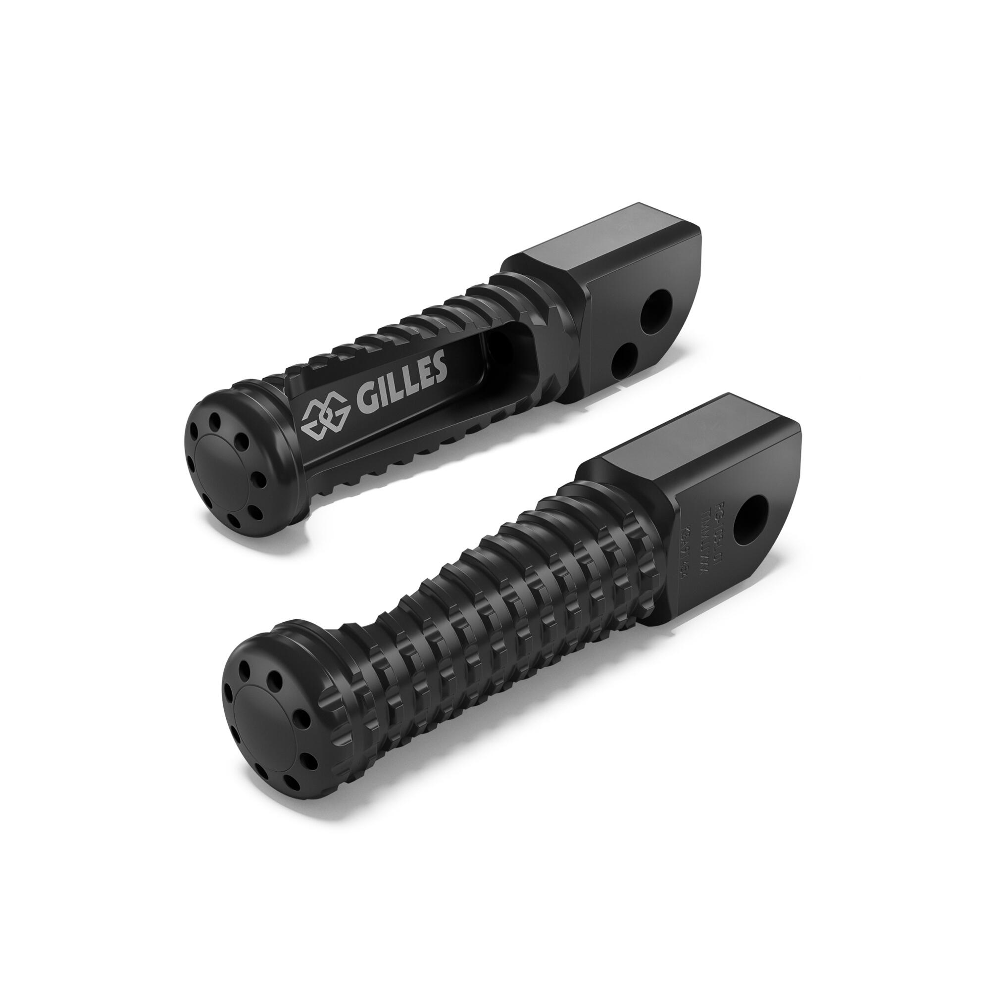 Nadomestni nasloni za noge za sopotnika, ki se privijejo, so lahki in zelo močni. Prilagodite te kovinske stopalke, da se ujemajo z vašim motorjem, za še bolj športen občutek in videz.